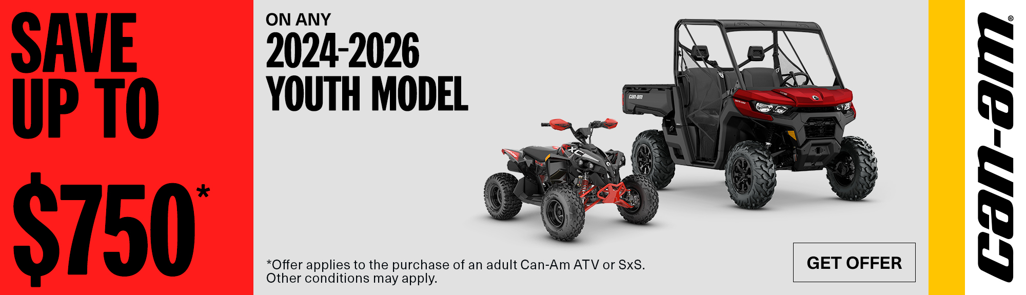 † Get a $500 rebate on eligible models: Consumers who purchase or purchased a new and unused 2024-2026 adult Can-Am ATV, Can-Am SSV, Lynx or Ski-Doo model (excl. NEOs) are eligible to an additional $500 rebate on any 2024-2026 eligible Youth model. Limit of one $500 rebate per transaction and per consumer. The purchase of the adult Can-Am ATV or Can-Am SSV vehicle must take place between July 1st, 2025 and March 31, 2026. The purchase of the adult Lynx or Ski-Doo vehicle must take place between April 1st, 2025 and March 31st, 2026.