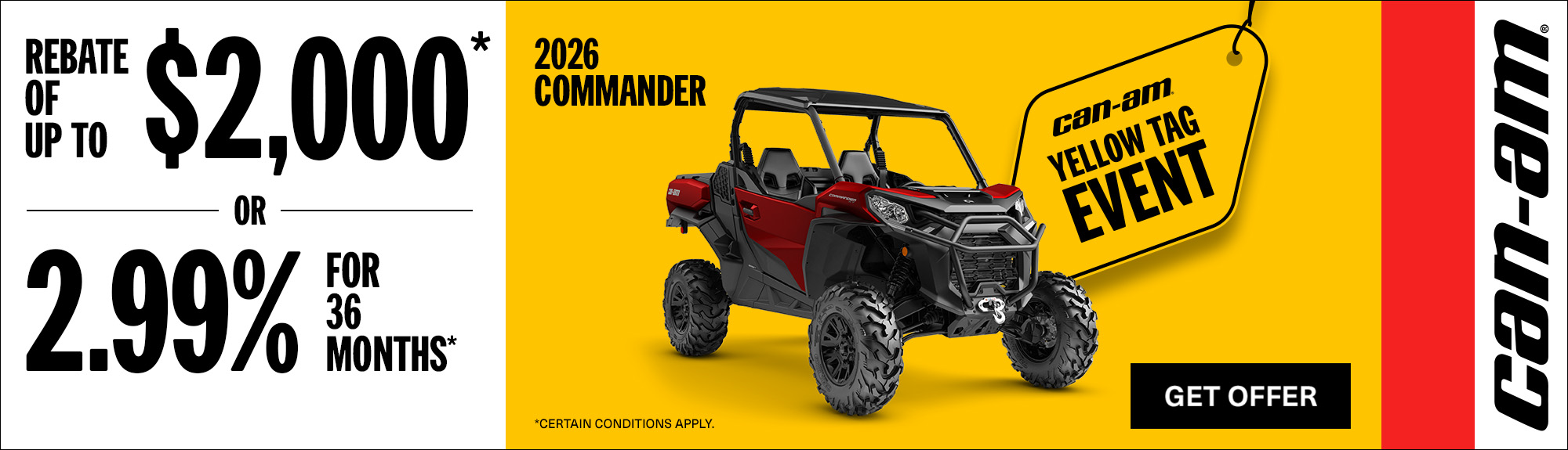 "©2026 Bombardier Recreational Products Inc. (BRP). All rights reserved. ®, ™ and the BRP logo are trademarks of BRP or its affiliates. In the U.S.A., products are distributed by BRP US Inc. Offers valid in U.S.A. only from March 1, 2026 to April 30, 2026. The conditions may vary depending on your location and this offer is subject to termination or change at any time without notice. This offer is not refundable, exchangeable or transferable (including from one dealership to another), cannot be redeemed for cash, credit or other products of equivalent value. Null where prohibited by law. Until supplies last. Eligible units for the announced rebate are all new and unused 2025 Commander 1000R, Maverick Sport and eligible units for the announced promotional financing are all new and unused 2025 Commander 1000R, Maverick Sport, Defender DPS CAB HD9 models. Other Can-Am off-road models may qualify for rebates or promotional financing, see local dealers for details.