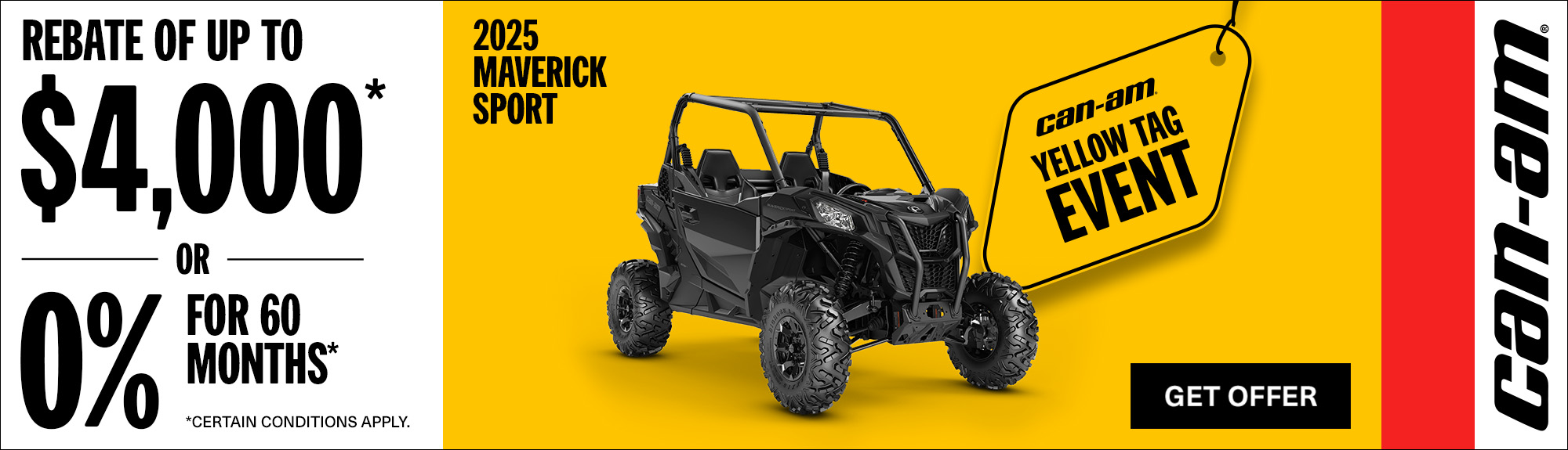 Rebate of up to $4,000 or 0% for 60 months on select 2025 Can-Am Maverick Trail & Sport models