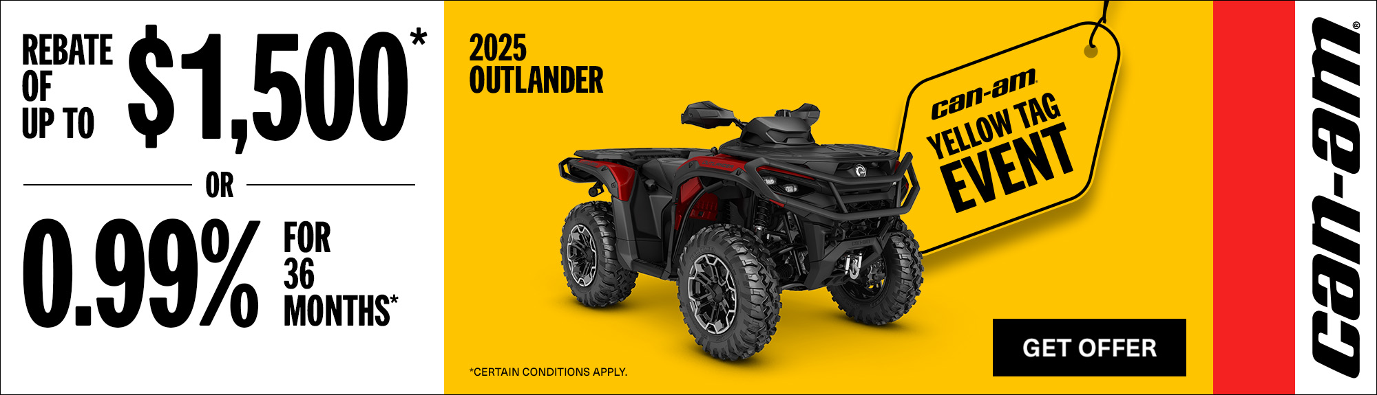 Rebate of up to $1500 or 0.99% for 36 months on select 2025 Can-Am Outlander models